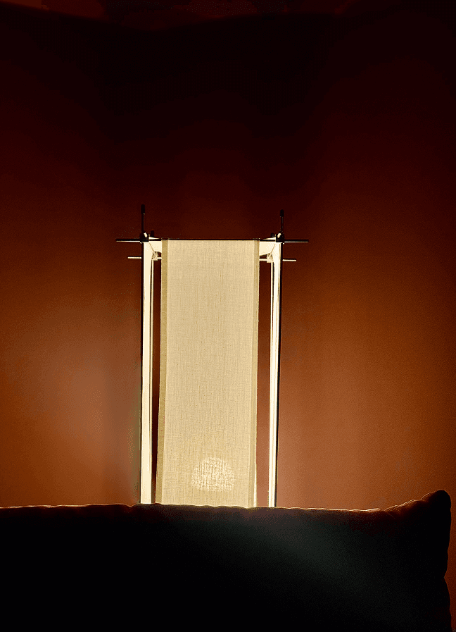 This piece features a cotton fabric stretched onto the construction of the lamp. All pieces in the collection are built on the AXI3 © modular system.